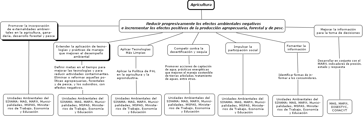estrategia7, Reducir progresivamente los efectos ambientales negativos e incrementar los efectos positivos de la producción agropecuaria, forestal y de pesca ???? Aplicar Tecnologías Más Limpias, Reducir progresivamente los efectos ambientales negativos e incrementar los efectos positivos de la producción agropecuaria, forestal y de pesca ???? Extender la aplicación de tecno- logías y prácticas de manejo que mejoren el desempeño ambiental, Reducir progresivamente los efectos ambientales negativos e incrementar los efectos positivos de la producción agropecuaria, forestal y de pesca ???? Competir contra la desertificación y sequía, Reducir progresivamente los efectos ambientales negativos e incrementar los efectos positivos de la producción agropecuaria, forestal y de pesca ???? Promover la incorporación de externalidades ambien- tales en la agricultura, gana- dería, desarrollo forestal y pesca, Aplicar Tecnologías Más Limpias Aplicar la Política de P+L en la agricultura y la agroindustria. Unidades Ambientales del SINAMA: MAG, MARN, Munici- palidades, MSPAS, Ministe- rios de Trabajo, Economía y Educación, Fomentar la información Identificar formas de in- formar a los consumidores. Unidades Ambientales del SINAMA: MAG, MARN, Munici- palidades, MSPAS, Ministe- rios de Trabajo, Economía y Educación, Reducir progresivamente los efectos ambientales negativos e incrementar los efectos positivos de la producción agropecuaria, forestal y de pesca ???? Impulsar la participación social, Agricultura ???? Reducir progresivamente los efectos ambientales negativos e incrementar los efectos positivos de la producción agropecuaria, forestal y de pesca, Impulsar la participación social ???? Unidades Ambientales del SINAMA: MAG, MARN, Munici- palidades, MSPAS, Ministe- rios de Trabajo, Economía y Educación, Competir contra la desertificación y sequía Promover acciones de captación de agua, prácticas energéticas que mejoren el manejo sostenible de tierras arboladas, tratamiento de aguas, entre otras. Unidades Ambientales del SINAMA: MAG, MARN, Munici- palidades, MSPAS, Ministe- rios de Trabajo, Economía y Educación