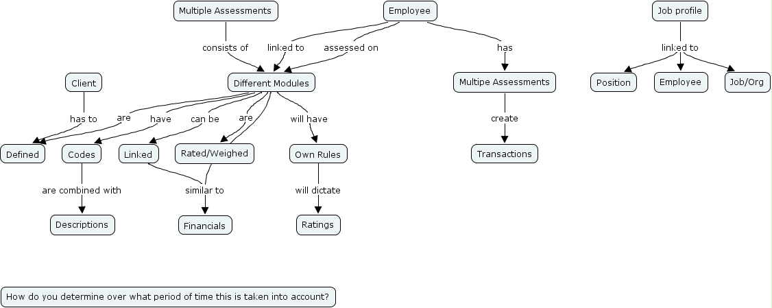 Multiple Assessments, Codes are combined with Descriptions, Job profile linked to Position, Employee linked to Different Modules, Different Modules will have Own Rules, Client has to Defined, Own Rules will dictate Ratings, Job profile linked to Employee, Different Modules are Rated/Weighed, Different Modules similar to Financials, Different Modules have Codes