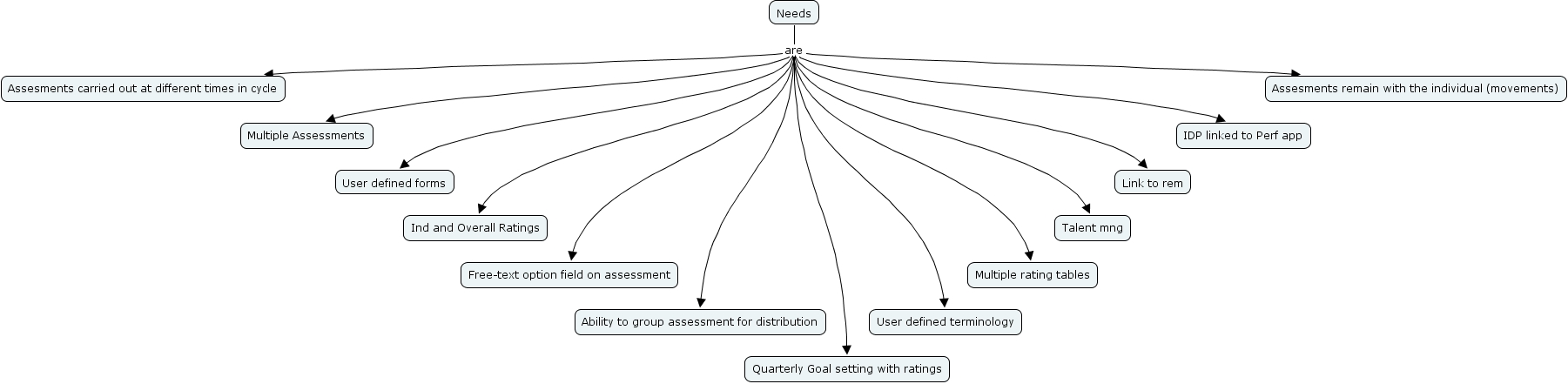 Whats Necessary, Needs are Free-text option field on assessment, Needs are IDP linked to Perf app, Needs are Assesments carried out at different times in cycle, Needs are Quarterly Goal setting with ratings, Needs are Multiple Assessments, Needs are Assesments remain with the individual (movements), Needs are User defined forms, Needs are Multiple rating tables, Needs are Ability to group assessment for distribution, Needs are User defined terminology