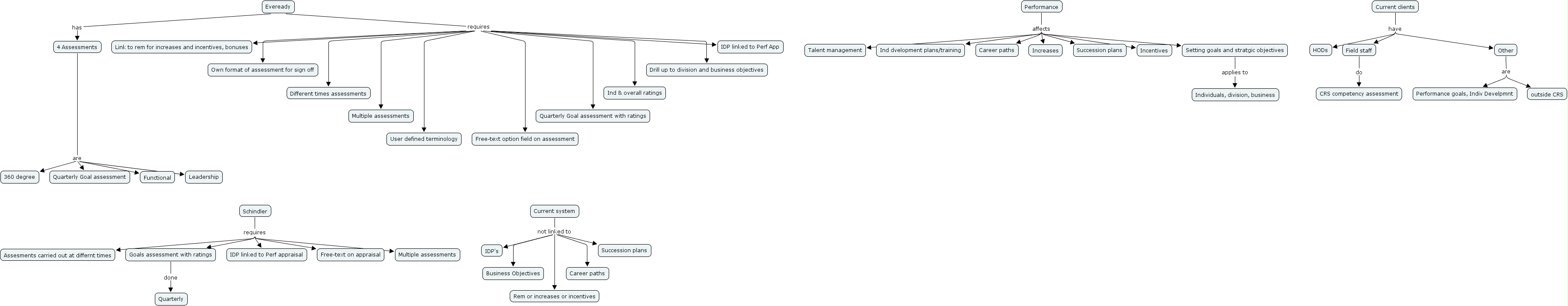 Eveready, Eveready requires Quarterly Goal assessment with ratings, Eveready has 4 Assessments, Performance affects Succession plans, Eveready requires Free-text option field on assessment, Eveready requires Different times assessments, Schindler requires Goals assessment with ratings, Eveready requires Multiple assessments, Other are outside CRS, Current system not linked to Succession plans, Current system not linked to Rem or increases or incentives