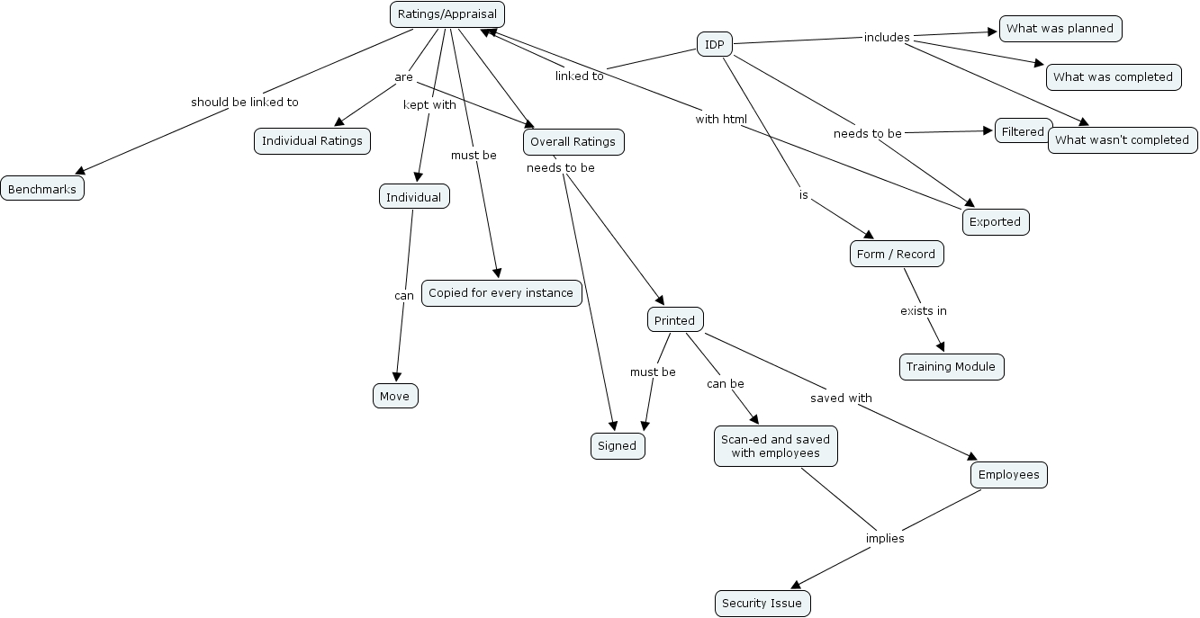 Ratings and Appraisals, Printed saved with Employees, IDP includes What wasn't completed, Scan-ed and saved with employees implies Security Issue, IDP linked to Ratings/Appraisal, Printed can be Scan-ed and saved with employees, Ratings/Appraisal must be Copied for every instance, IDP needs to be Exported, Ratings/Appraisal are Individual Ratings, Form / Record exists in Training Module, Ratings/Appraisal should be linked to Benchmarks