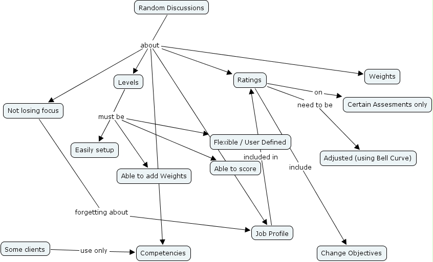 Random Discussions, Levels must be Easily setup, Random Discussions about Ratings, Job Profile included in Ratings, Random Discussions about Job Profile, Levels must be Able to score, Levels must be Able to add Weights, Levels must be Flexible / User Defined, Random Discussions about Weights, Random Discussions about Not losing focus, Not losing focus forgetting about Job Profile