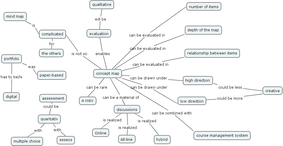 Seigo2, complicated for the others, evaluation will be qualitative, low direction could be more creative, concept map can be drawn under low direction, assessment could be quantativ, concept map can be rare a copy, concept map is not so complicated, portfolio was paper-based, concept map can be evaluated in number of items, mind map is complicated