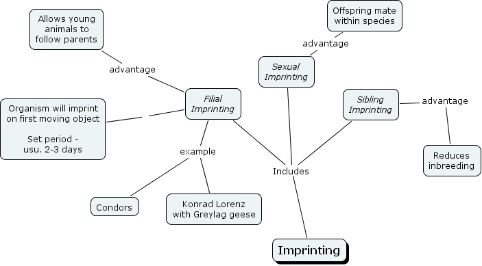 Imprinting Tom K, Filial Imprinting example Condors, Filial Imprinting advantage Allows young animals to follow parents, Filial Imprinting example Konrad Lorenz with Greylag geese, Filial Imprinting Organism will imprint on first moving object Set period - usu. 2-3 days, Sexual Imprinting advantage Offspring mate within species, Imprinting Includes Filial Imprinting, Imprinting Includes Sibling Imprinting, Sibling Imprinting advantage Reduces inbreeding, Imprinting Includes Sexual Imprinting