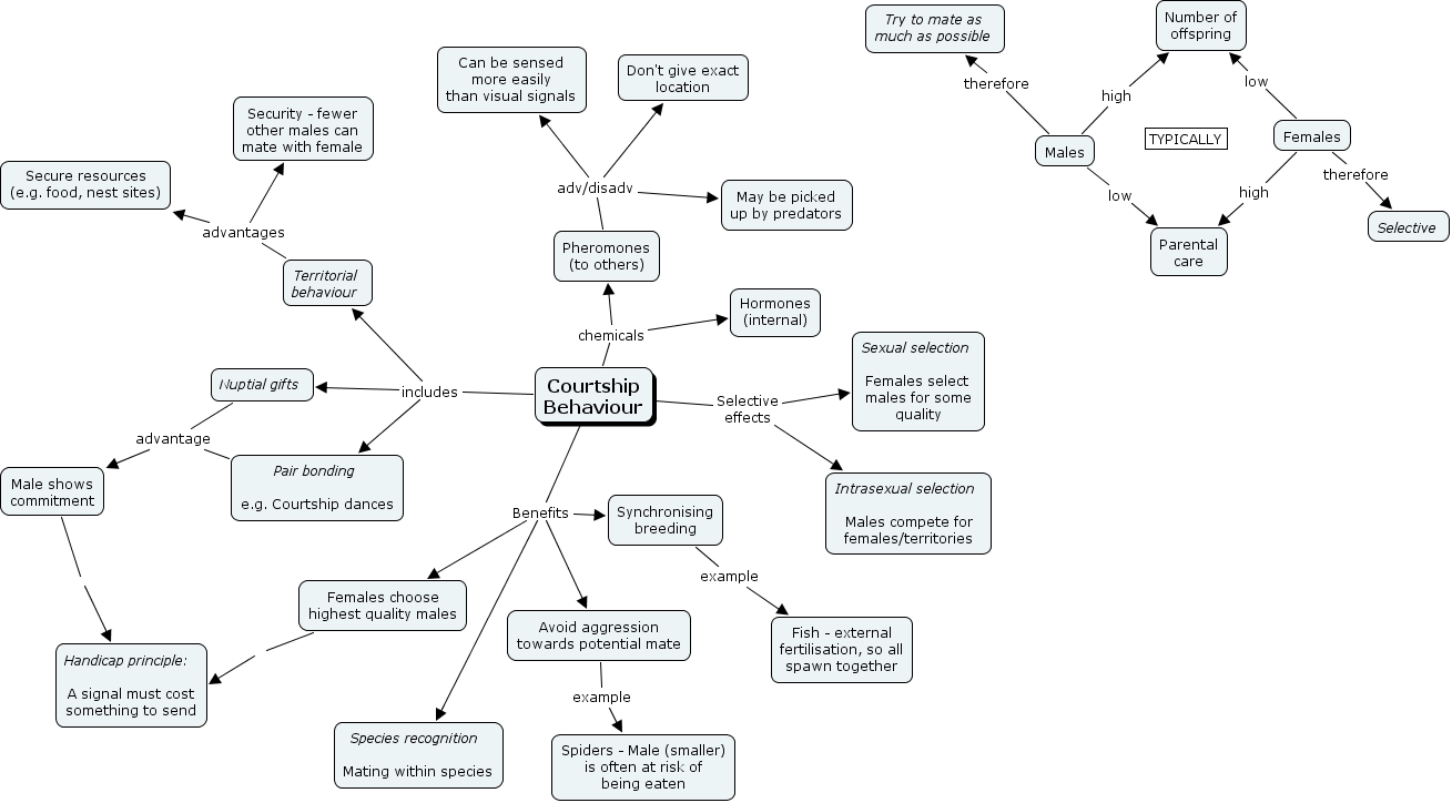 Courtship behaviour Tom K, Courtship Behaviour chemicals Hormones (internal), Courtship Behaviour Selective effects Sexual selection Females select males for some quality, Courtship Behaviour Benefits Species recognition Mating within species, Females choose highest quality males Handicap principle: A signal must cost something to send, Courtship Behaviour Benefits Synchronising breeding, Courtship Behaviour includes Territorial behaviour, Males therefore Try to mate as much as possible, Territorial behaviour advantages Security - fewer other males can mate with female, Courtship Behaviour includes Pair bonding e.g. Courtship dances, Males high Number of offspring