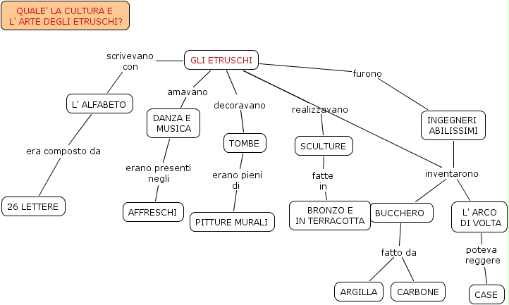 CULTURA E ARTE DEGLI ETRUSCHI, GLI ETRUSCHI inventarono L' ARCO DI VOLTA, GLI ETRUSCHI realizzavano SCULTURE, GLI ETRUSCHI furono INGEGNERI ABILISSIMI, TOMBE erano pieni di PITTURE MURALI, DANZA E MUSICA erano presenti negli AFFRESCHI, GLI ETRUSCHI inventarono BUCCHERO, SCULTURE fatte in BRONZO E IN TERRACOTTA, L' ARCO DI VOLTA poteva reggere CASE, GLI ETRUSCHI decoravano TOMBE, GLI ETRUSCHI amavano DANZA E MUSICA