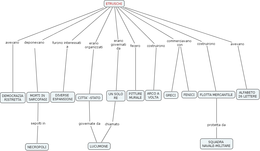 CARATTERISTICHE SOCIETA' ETRUSCA, ETRUSCHI erano governati da UN SOLO RE, ETRUSCHI furono interessati a DIVERSE ESPANSIONI, ETRUSCHI commerciavano con GRECI, ETRUSCHI deponevano MORTI IN SARCOFAGI, ETRUSCHI erano organizzati CITTA' -STATO, ETRUSCHI costruirono FLOTTA MERCANTILE, ETRUSCHI avevano DEMOCRAZIA RISTRETTA, CITTA' -STATO governate da LUCUMONE, MORTI IN SARCOFAGI sepolti in NECROPOLI, UN SOLO RE chiamato LUCUMONE