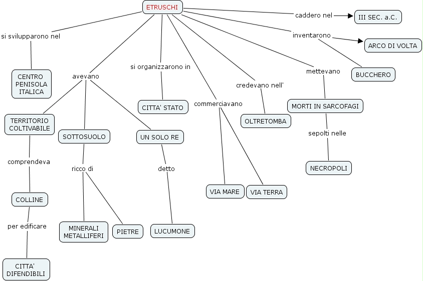 CARATTERISTICHE ETRUSCHI, COLLINE per edificare CITTA' DIFENDIBILI, ETRUSCHI credevano nell' OLTRETOMBA, ETRUSCHI avevano TERRITORIO COLTIVABILE, UN SOLO RE detto LUCUMONE, MORTI IN SARCOFAGI sepolti nelle NECROPOLI, ETRUSCHI commerciavano VIA TERRA, ETRUSCHI inventarono BUCCHERO, SOTTOSUOLO ricco di MINERALI METALLIFERI, ETRUSCHI commerciavano VIA MARE, ETRUSCHI inventarono ARCO DI VOLTA