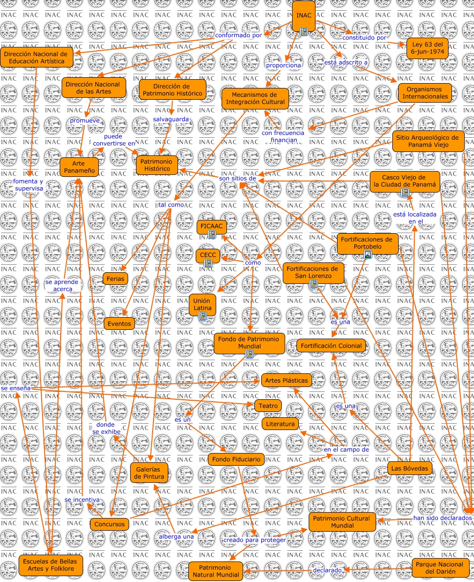 INAC, INAC conformado por Dirección de Patrimonio Histórico, Organismos Internacionales como FICAAC, Concursos en el campo de Literatura, Organismos Internacionales como Unión Latina, Fortificaciones de Portobelo han sido declarados Patrimonio Cultural Mundial, Fondo Fiduciario creado para proteger Patrimonio Natural Mundial, Sitio Arqueológico de Panamá Viejo han sido declarados Patrimonio Cultural Mundial, Dirección Nacional de las Artes promueve Arte Panameño, Escuelas de Bellas Artes y Folklore se enseña Teatro, Casco Viejo de la Ciudad de Panamá han sido declarados Patrimonio Cultural Mundial