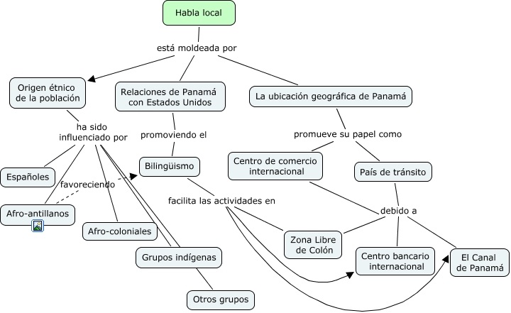 Habla local, Habla local está moldeada por Origen étnico de la población, La ubicación geográfica de Panamá promueve su papel como País de tránsito, Bilingüismo facilita las actividades en Centro bancario internacional, Bilingüismo facilita las actividades en El Canal de Panamá, Centro de comercio internacional debido a Zona Libre de Colón, Afro-antillanos favoreciendo Bilingüismo, País de tránsito debido a Zona Libre de Colón, País de tránsito debido a Centro bancario internacional, Origen étnico de la población ha sido influenciado por Afro-antillanos, País de tránsito debido a El Canal de Panamá