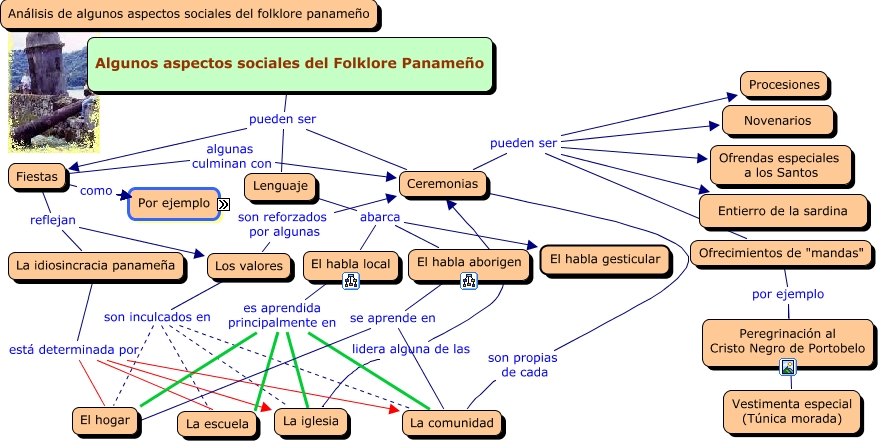 aspectos sociales del folklore, Ceremonias pueden ser Entierro de la sardina, Los valores son reforzados por algunas Ceremonias, La idiosincracia panameña está determinada por La escuela, Los valores son inculcados en El hogar, Fiestas como Navidad y Año Nuevo, Lenguaje abarca El habla gesticular, Lenguaje abarca El habla aborigen, Los valores son inculcados en La escuela, La idiosincracia panameña está determinada por El hogar, La idiosincracia panameña está determinada por La iglesia