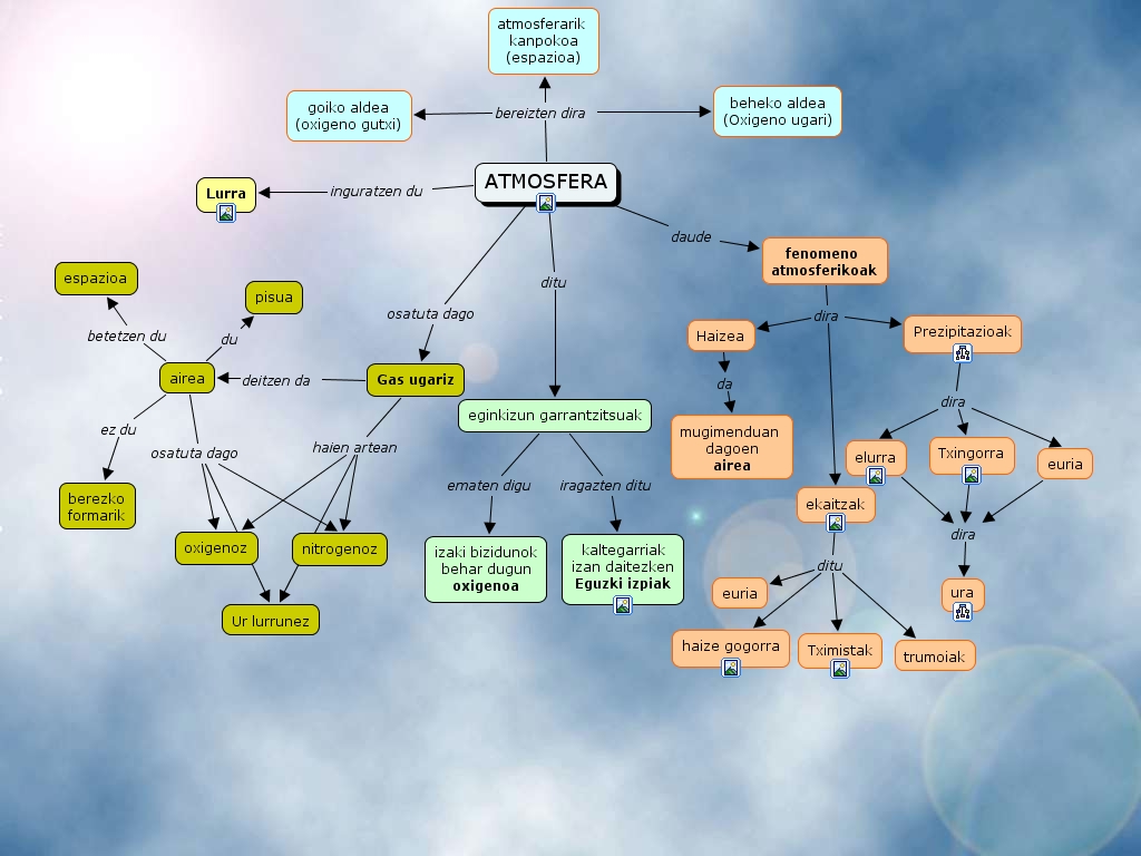 atmosfera, Gas ugariz haien artean oxigenoz, ATMOSFERA bereizten dira beheko aldea (Oxigeno ugari), airea osatuta dago nitrogenoz, fenomeno atmosferikoak dira ekaitzak, fenomeno atmosferikoak dira Prezipitazioak, euria dira ura, ekaitzak ditu euria, ATMOSFERA inguratzen du Lurra, eginkizun garrantzitsuak ematen digu izaki bizidunok behar dugun oxigenoa, eginkizun garrantzitsuak iragazten ditu kaltegarriak izan daitezken Eguzki izpiak