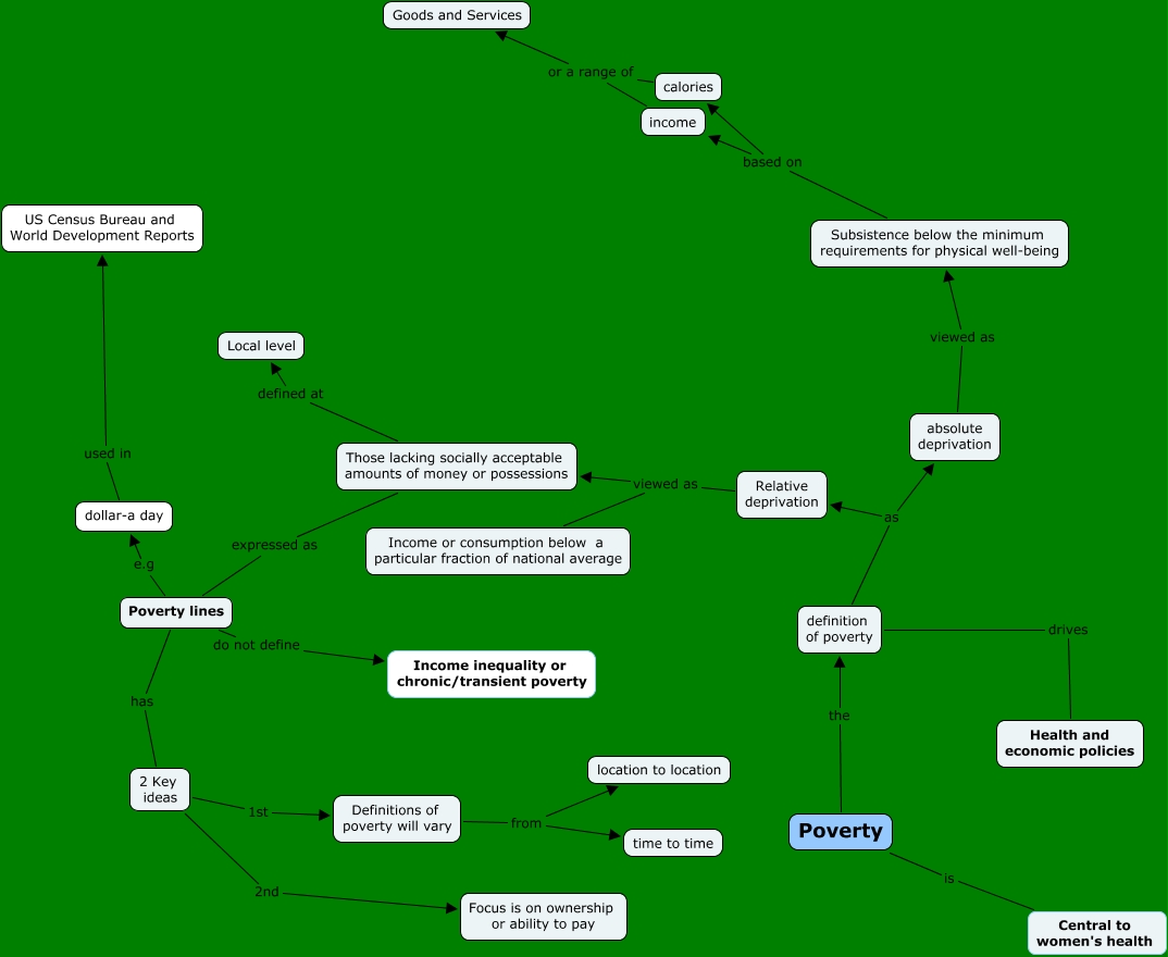 This Concept Map, created with IHMC CmapTools, has information related to: 11.2 Defining Poverty, 2 Key ideas 2nd Focus is on ownership or ability to pay, Subsistence below the minimum requirements for physical well-being based on income, Poverty lines has 2 Key ideas, Those lacking socially acceptable amounts of money or possessions defined at Local level, Relative deprivation viewed as Those lacking socially acceptable amounts of money or possessions, income or a range of Goods and Services, Poverty the definition of poverty, definition of poverty as absolute deprivation, Relative deprivation viewed as Income or consumption below a particular fraction of national average, dollar-a day used in US Census Bureau and World Development Reports, absolute deprivation viewed as Subsistence below the minimum requirements for physical well-being, Those lacking socially acceptable amounts of money or possessions expressed as Poverty lines, Definitions of poverty will vary from time to time, Poverty lines do not define Income inequality or chronic/transient poverty, definition of poverty as Relative deprivation, Poverty lines e.g dollar-a day, 2 Key ideas 1st Definitions of poverty will vary, Subsistence below the minimum requirements for physical well-being based on calories, Definitions of poverty will vary from location to location, Poverty is Central to women's health
