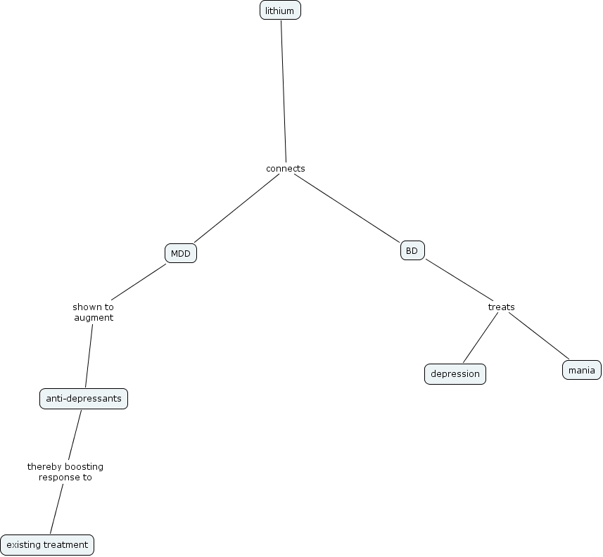 MDD_BP Lithium, lithium connects MDD, anti-depressants thereby boosting response to existing treatment, lithium connects BD, BD treats mania, BD treats depression, MDD shown to augment anti-depressants