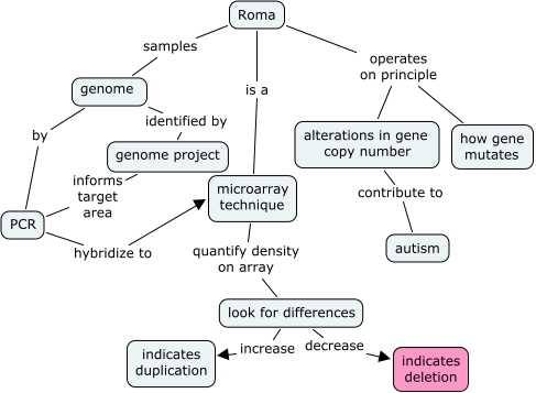 Autism Roma, PCR hybridize to microarray technique, look for differences increase indicates duplication, microarray technique quantify density on array look for differences, Roma is a microarray technique, Roma samples genome, genome by PCR, genome project informs target area PCR, genome identified by genome project, look for differences decrease indicates deletion, Roma operates on principle how gene mutates