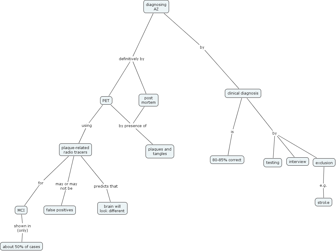 AZ diagnozing AZ, post mortem by presence of plaques and tangles, diagnosing AZ by clinical diagnosis, exclusion e.g. stroke, clinical diagnosis by testing, clinical diagnosis by exclusion, clinical diagnosis by interview, MCI shown in (only) about 50% of cases, plaque-related radio tracers for MCI, PET by presence of plaques and tangles, PET using plaque-related radio tracers