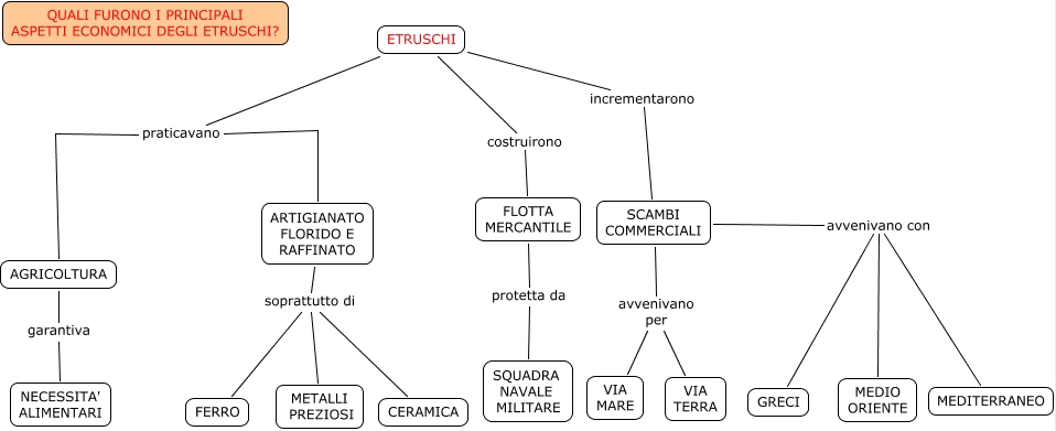 principali aspetti economici degli Etruschi, ETRUSCHI praticavano ARTIGIANATO FLORIDO E RAFFINATO, ARTIGIANATO FLORIDO E RAFFINATO soprattutto di FERRO, ETRUSCHI costruirono FLOTTA MERCANTILE, SCAMBI COMMERCIALI avvenivano per VIA TERRA, SCAMBI COMMERCIALI avvenivano con MEDITERRANEO, ARTIGIANATO FLORIDO E RAFFINATO soprattutto di METALLI PREZIOSI, FLOTTA MERCANTILE protetta da SQUADRA NAVALE MILITARE, SCAMBI COMMERCIALI avvenivano per VIA MARE, SCAMBI COMMERCIALI avvenivano con GRECI, ETRUSCHI incrementarono SCAMBI COMMERCIALI