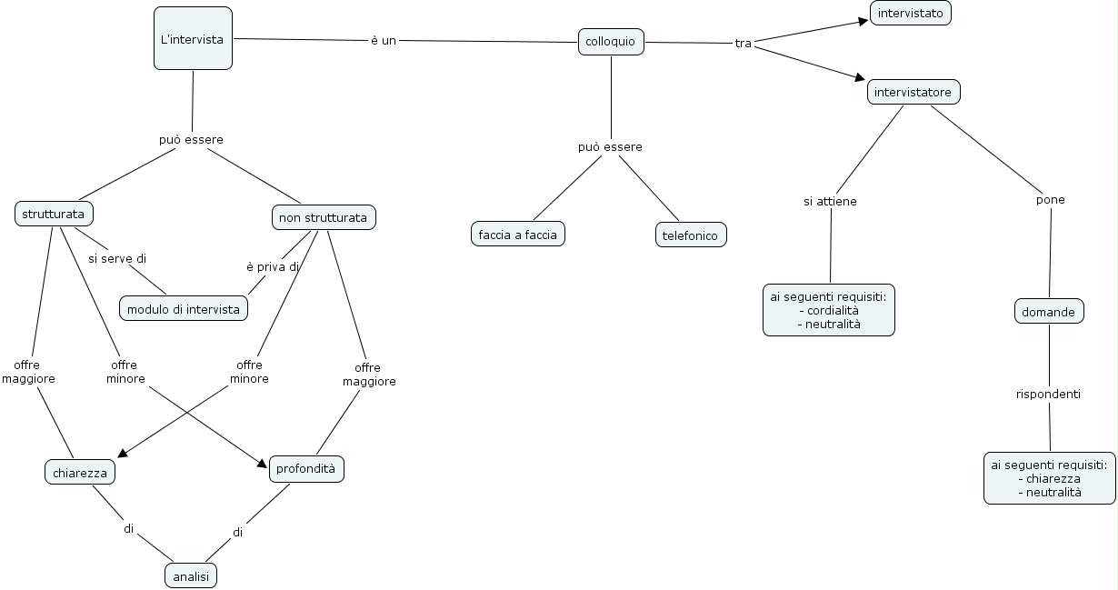intervista, L'intervista può essere strutturata, strutturata offre maggiore chiarezza, L'intervista può essere non strutturata, domande rispondenti ai seguenti requisiti: - chiarezza - neutralità, colloquio può essere telefonico, colloquio tra intervistato, profondità di analisi, strutturata offre minore profondità, non strutturata offre minore chiarezza, strutturata si serve di modulo di intervista