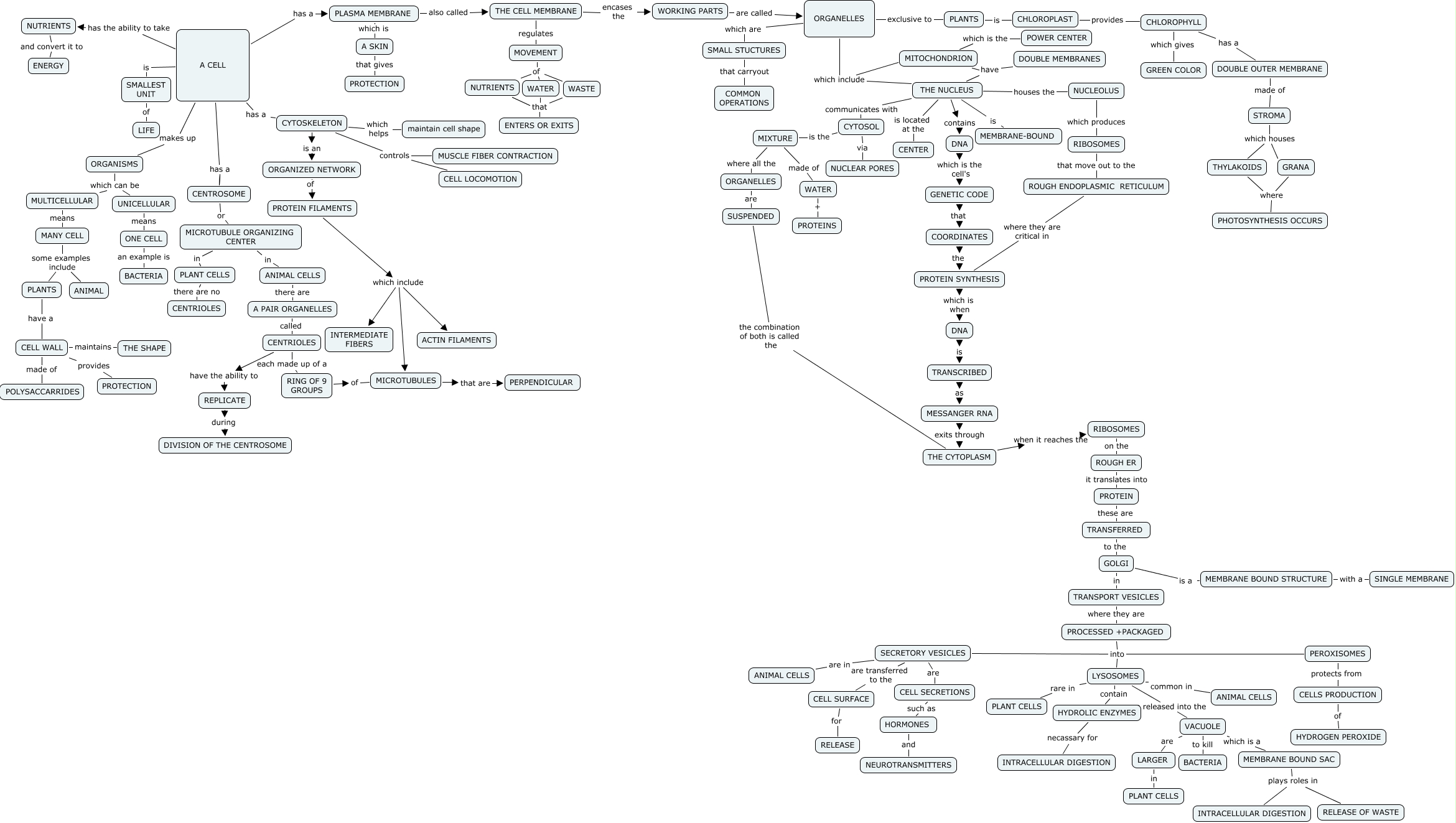Theres'a Cell Map, SUSPENDED the combination of both is called the THE CYTOPLASM, MITOCHONDRION have DOUBLE MEMBRANES, SECRETORY VESICLES are in ANIMAL CELLS, REPLICATE during DIVISION OF THE CENTROSOME, PROTEIN FILAMENTS which include INTERMEDIATE FIBERS, THE NUCLEUS have DOUBLE MEMBRANES, TRANSFERRED to the GOLGI, MICROTUBULE ORGANIZING CENTER in PLANT CELLS, CYTOSOL via NUCLEAR PORES, CHLOROPHYLL which gives GREEN COLOR