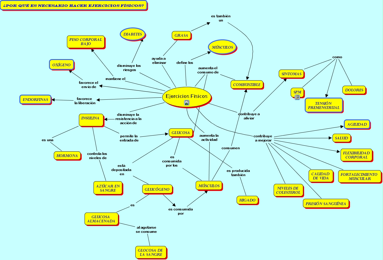 Sintomas como SPM, Ejercicios Físicos aumenta la actividad músculos, glucosa es producida también Higado, Ejercicios Físicos contribuye a mejorar niveles de colesterol, Insulina controla los niveles de Azúcar en Sangre, Ejercicios Físicos aumenta el consumo de glucosa, Ejercicios Físicos contribuye a mejorar fortalecimiento muscular, Ejercicios Físicos favorece la liberación endorfinas, Ejercicios Físicos contribuye a mejorar Agilidad, glucógeno es glucosa almacenada, Ejercicios Físicos contribuye a mejorar presión sanguínea, Ejercicios Físicos define los Músculos, glucosa está depositada en glucógeno, Ejercicios Físicos contribuye a mejorar Salud, músculos consumen combustible, Sintomas como tensión premenstrual, Ejercicios Físicos contribuye a aliviar Sintomas, Insulina es una hormona, Insulina permite la entrada de glucosa, músculos consumen combustible, Insulina es una hormona, glucógeno es consumida por músculos, Ejercicios Físicos disminuye la resistencia a la acción de Insulina, Grasa ayuda a eliminar Ejercicios Físicos, Ejercicios Físicos contribuye a mejorar flexibilidad corporal, Ejercicios Físicos aumenta el consumo de combustible, glucosa almacenada al agotarse se consume glocosa de la sangre, Sintomas como dolores, glucosa es consumida por los músculos, Ejercicios Físicos favorece el envío de oxígeno, Grasa es también un combustible, Ejercicios Físicos contribuye a mejorar Calidad de vida, Ejercicios Físicos mantiene el peso corporal bajo, Ejercicios Físicos disminuye los riesgos Diabetes, glucógeno es glucosa almacenada