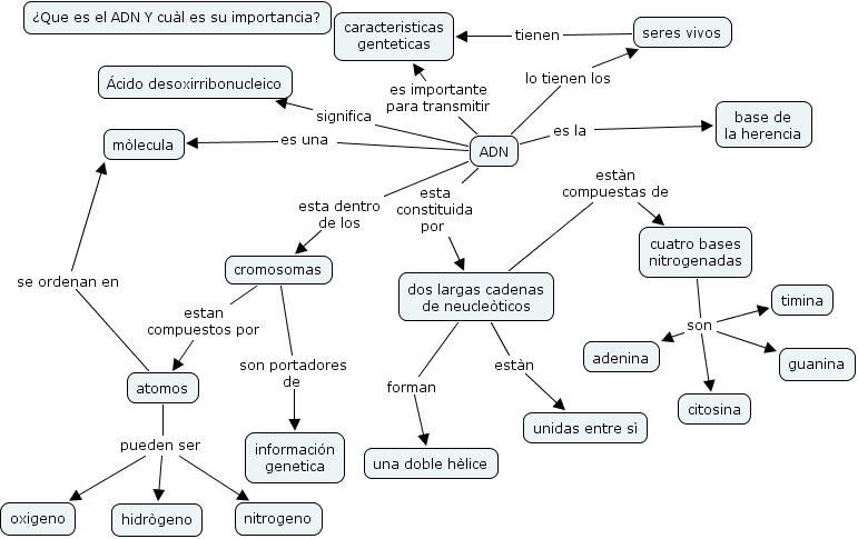 ADN, cromosomas estan compuestos por atomos, atomos pueden ser oxigeno, ADN es una mòlecula, cromosomas son portadores de información genetica, ADN lo tienen los seres vivos, ADN significa �?cido desoxirribonucleico, dos largas cadenas de neucleòticos forman una doble hèlice, dos largas cadenas de neucleòticos estàn compuestas de cuatro bases nitrogenadas, cuatro bases nitrogenadas son citosina, ADN esta dentro de los cromosomas