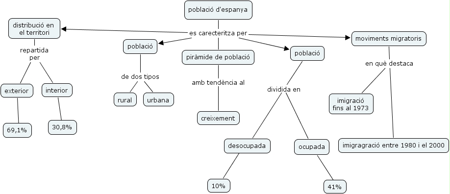 marcm, ocupada ???? 41%, moviments migratoris en què destaca imigració fins al 1973, població de dos tipos rural, exterior ???? 69,1%, distribució en el territori repartida per exterior, població de dos tipos urbana, interior ???? 30,8%, desocupada ???? 10%, població d'espanya es carecteritza per piràmide de població, població d'espanya es carecteritza per població