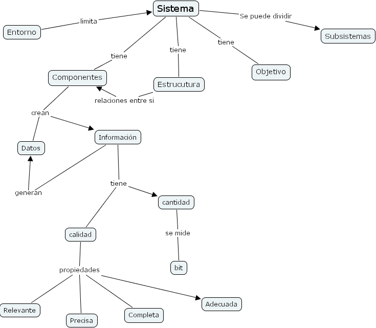 Sistema tiene Componentes, Componentes crean Informaci�n, Componentes crean Datos, Informaci�n tiene cantidad, Informaci�n tiene calidad, Sistema tiene Objetivo, cantidad se mide bit, Estrucutura relaciones entre si Componentes, Informaci�n generan Datos, calidad propiedades Relevante, calidad propiedades Adecuada, calidad propiedades Completa, calidad propiedades Precisa, Sistema tiene Estrucutura, Sistema Se puede dividir Subsistemas, Entorno limita Sistema