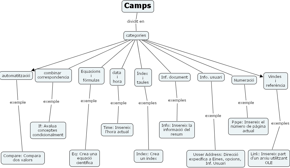 Inf. document exemples Info: Insereix la informaci� del resum, Vincles i refer�ncia exemples Link: Insereix part d'un arxiu utilitzant OLE, Numeraci� exemple Page: Insereix el n�mero de p�gina actual, automatitzaci� exemple Compare: Compara dos valors, categories ???? combinar correspondencia, categories ???? �ndex i taules, categories ???? Numeraci�, categories ???? Vincles i refer�ncia, categories ???? Inf. document, categories ???? data i hora, categories ???? Info. usuari, categories ???? automatitzaci�, categories ???? Equacions i f�rmulas, data i hora exemple Time: Insereix l'hora actual, �ndex i taules exemples Index: Crea un �ndex, Camps dividit en categories, Info. usuari exemple Usser Address: Direcci� expec�fica a Eines, opcions, Inf. Usuari, Equacions i f�rmulas exemple Eq: Crea una equaci� cient�fica, combinar correspondencia exemple If: Avalua conceptes condicionalment