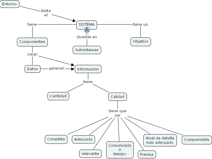 SISTEMA divisible en Subsistemas, SISTEMA tiene un Objetivo, SISTEMA tiene Componentes, Informaci�n tiene Cantidad, Informaci�n tiene Calidad, Entorno limita el SISTEMA, Datos generan Informaci�n, Componentes crean Informaci�n, Componentes crean Datos, Calidad tiene que ser Nivel de detalle m�s adecuado, Calidad tiene que ser Comunicada a tiempo, Calidad tiene que ser Comprensible, Calidad tiene que ser relevante, Calidad tiene que ser Adecuada, Calidad tiene que ser Precisa, Calidad tiene que ser Completa