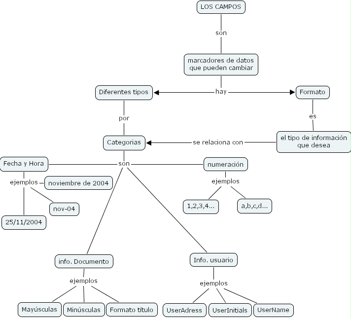 LOS CAMPOS son marcadores de datos que pueden cambiar, Info. usuario ejemplos UserInitials, Info. usuario ejemplos UserName, Info. usuario ejemplos UserAdress, Categorias son info. Documento, Categorias son numeraci�n, Categorias son Fecha y Hora, Categorias son Info. usuario, info. Documento ejemplos May�sculas, info. Documento ejemplos Min�sculas, info. Documento ejemplos Formato t�tulo, marcadores de datos que pueden cambiar hay Formato, marcadores de datos que pueden cambiar hay Diferentes tipos, Formato es el tipo de informaci�n que desea, Fecha y Hora ejemplos nov-04, Fecha y Hora ejemplos noviembre de 2004, Fecha y Hora ejemplos 25/11/2004, numeraci�n ejemplos a,b,c,d..., numeraci�n ejemplos 1,2,3,4..., el tipo de informaci�n que desea se relaciona con Categorias, Diferentes tipos por Categorias