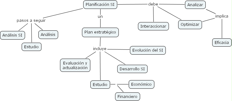 Evoluci�n del SI incluye Evaluaci�n y actualizaci�n, Evoluci�n del SI incluye Estudio, Evoluci�n del SI incluye Desarrollo SI, Plan estrat�gico incluye Evaluaci�n y actualizaci�n, Plan estrat�gico incluye Estudio, Plan estrat�gico incluye Desarrollo SI, Planificaci�n SI un Plan estrat�gico, Analizar implica Eficacia, Planificaci�n SI debe Optimizar, Planificaci�n SI debe Interaccionar, Optimizar implica Eficacia, Econ�mico Financiero, Estudio Financiero, Planificaci�n SI pasos a seguir An�lisis SI, Planificaci�n SI pasos a seguir Estudio, Planificaci�n SI pasos a seguir An�lisis, Analizar debe Optimizar, Analizar debe Interaccionar