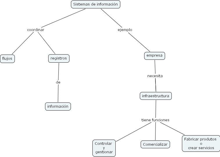 infraestructura tiene funciones Controlar y gestionar, infraestructura tiene funciones Comercializar, infraestructura tiene funciones Fabricar produtos o crear servicios, empresa necesita infraestructura, empresa necesita infraestructura, Sistemas de informaci�n coordinar flujos, Sistemas de informaci�n coordinar registros, registros de informaci�n, Sistemas de informaci�n ejemplo empresa