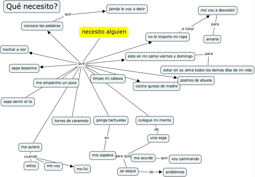 Necesito, necesito alguien que conozca las palabras, necesito alguien que hechar a reir, no le importe mi ropa si total me voy a desvestir, ponga tachuelas en mis zapatos, necesito alguien que no le importe mi ropa, necesito alguien que culegue mi mente, una soga para que me acurde, me voy a desvestir para amarla, me quiera cuando me voy, me quiera cuando me fui