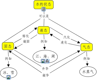 水的状态, 液态 汽化 气态, 固态 熔化 液态, 水的状态 可以是 固态, 液态 凝固 固态, 液态 例如 江、海、湖, 固态 例如 冰、雪, 气态 例如 水蒸气, 气态 液化 液态, 水的状态 可以是 液态, 水的状态 可以是 气态