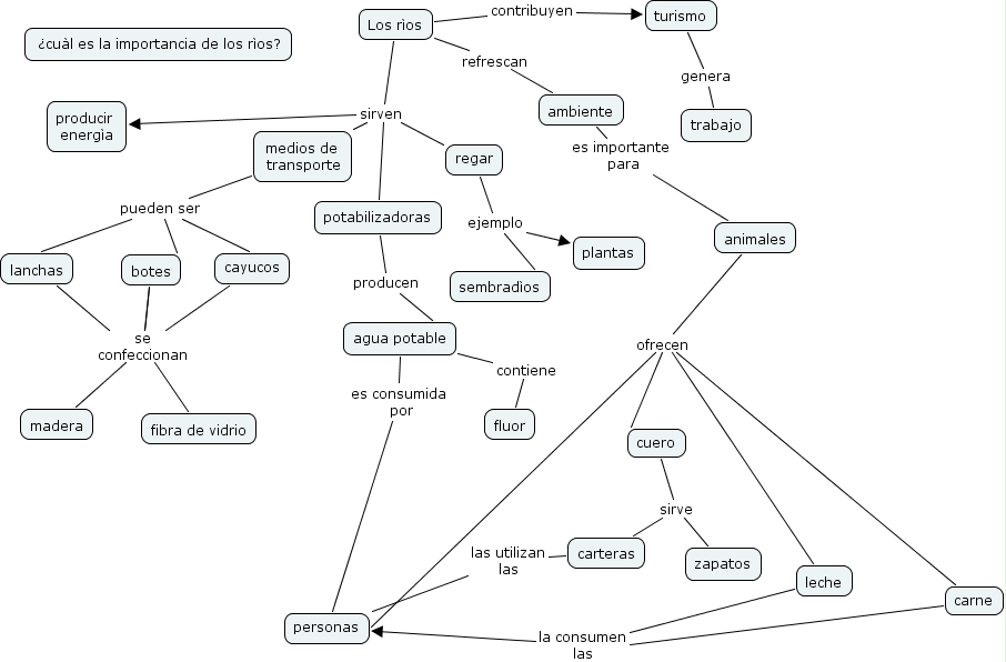 los rìos, agua potable contiene fluor, ambiente es importante para animales, Los rìos sirven potabilizadoras, agua potable es consumida por personas, turismo genera trabajo, regar ejemplo plantas, medios de transporte pueden ser cayucos, lanchas se confeccionan fibra de vidrio, Los rìos contribuyen turismo, carteras las utilizan las personas