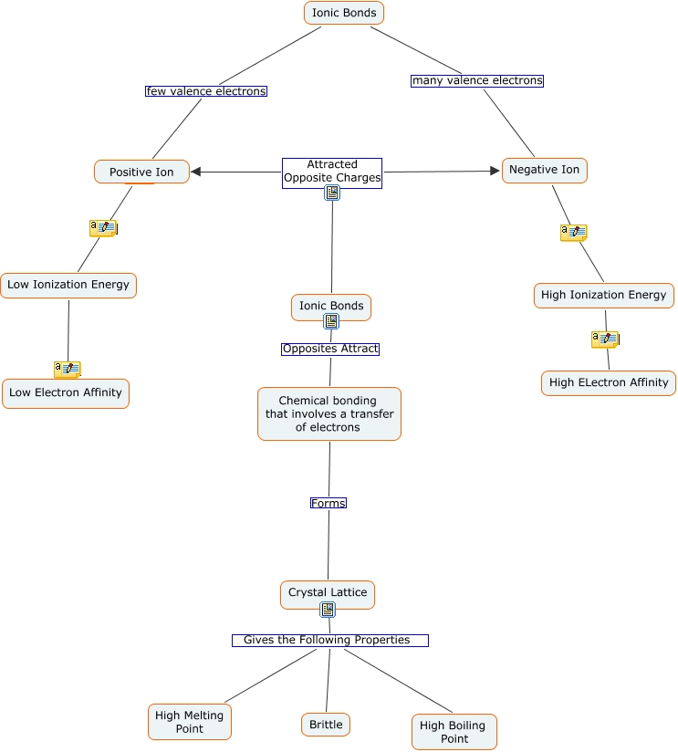 Ionic Bonding, Positive Ion Attracted Opposite Charges Negative Ion, Ionic Bonds few valence electrons Positive Ion, ???? ???? Low Ionization Energy, Ionic Bonds Opposites Attract Chemical bonding that involves a transfer of electrons, Crystal Lattice Gives the Following Properties Brittle, Ionic Bonds many valence electrons Negative Ion, Chemical bonding that involves a transfer of electrons Forms Crystal Lattice, Positive Ion Attracted Opposite Charges Ionic Bonds, Negative Ion ???? High Ionization Energy, Crystal Lattice Gives the Following Properties High Melting Point