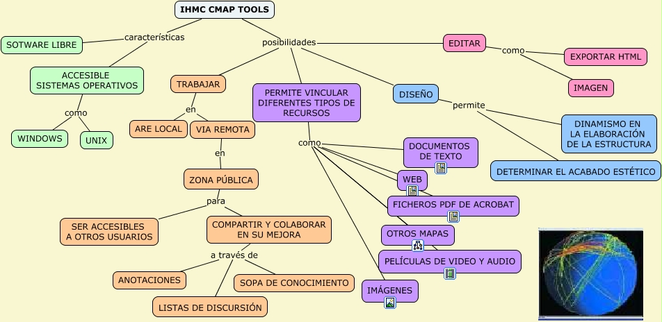 Este Cmap, tiene información relacionada con: IHMC CAMP TOOLS, COMPARTIR Y COLABORAR EN SU MEJORA a través de SOPA DE CONOCIMIENTO, ACCESIBLE SISTEMAS OPERATIVOS como WINDOWS, EDITAR como EXPORTAR HTML, ACCESIBLE SISTEMAS OPERATIVOS como UNIX, DISEÑO permite DETERMINAR EL ACABADO ESTÉTICO, IHMC CMAP TOOLS posibilidades PERMITE VINCULAR DIFERENTES TIPOS DE RECURSOS, TRABAJAR en ARE LOCAL, COMPARTIR Y COLABORAR EN SU MEJORA a través de LISTAS DE DISCURSIÓN, COMPARTIR Y COLABORAR EN SU MEJORA a través de ANOTACIONES, TRABAJAR en VIA REMOTA, PERMITE VINCULAR DIFERENTES TIPOS DE RECURSOS como OTROS MAPAS, PERMITE VINCULAR DIFERENTES TIPOS DE RECURSOS como IMÁGENES, PERMITE VINCULAR DIFERENTES TIPOS DE RECURSOS como WEB, DISEÑO permite DINAMISMO EN LA ELABORACIÓN DE LA ESTRUCTURA, ZONA PÚBLICA para SER ACCESIBLES A OTROS USUARIOS, IHMC CMAP TOOLS posibilidades DISEÑO, PERMITE VINCULAR DIFERENTES TIPOS DE RECURSOS como DOCUMENTOS DE TEXTO, IHMC CMAP TOOLS características ACCESIBLE SISTEMAS OPERATIVOS, VIA REMOTA en ZONA PÚBLICA, EDITAR como IMAGEN