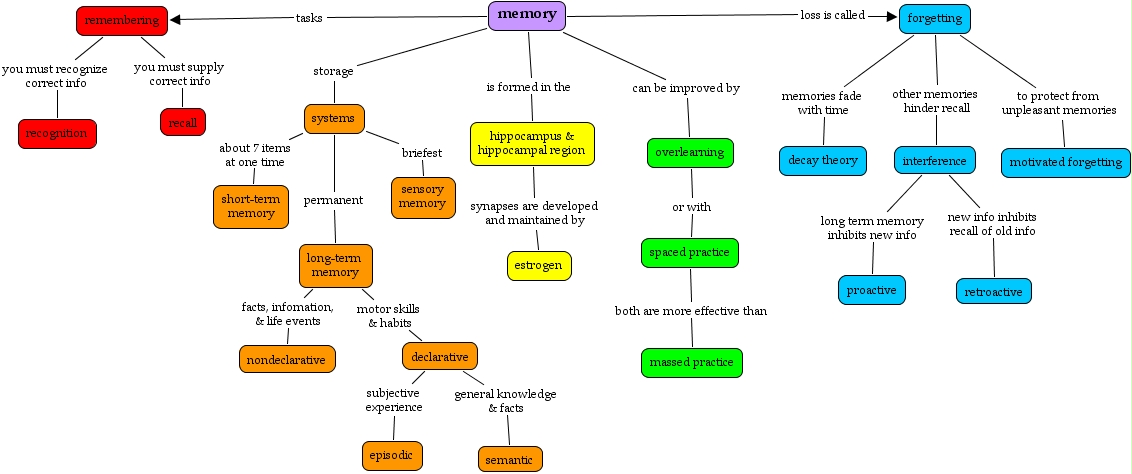 Chapter 6 Nicole Carlson, systems about 7 items at one time short-term memory, declarative subjective experience episodic, memory is formed in the hippocampus & hippocampal region, forgetting memories fade with time decay theory, hippocampus & hippocampal region synapses are developed and maintained by estrogen, forgetting other memories hinder recall interference, interference long term memory inhibits new info proactive, spaced practice both are more effective than massed practice, remembering you must supply correct info recall, forgetting memories fade with time decay theory
