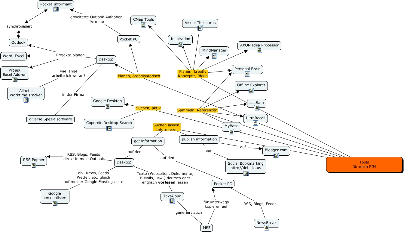 Este Cmap, tiene información relacionada con: Personal Information Management, Tools für mein PIM Sammeln, Referenzen askSam, Tools für mein PIM Planen, kreativ Konzepte, Ideen Visual Thesaurus, Tools für mein PIM Sammeln, Referenzen Personal Brain, Tools für mein PIM Sammeln, Referenzen MyBase, get information auf den Desktop, Desktop Texte (Webseiten, Dokumente, E-Mails, usw.) deutsch oder englisch vorlesen lassen TextAloud, publish information via Social Bookmarking http://del.icio.us, Desktop Projekte planen Outlook, Desktop Projekte planen Word, Excel, Pocket PC erweiterte Outlook Aufgaben Termine Pocket Informant, Pocket PC RSS, Blogs, Feeds NewsBreak, MP3 für unterwegs kopieren auf Pocket PC, Tools für mein PIM Planen, kreativ Konzepte, Ideen Personal Brain, Desktop wie lange arbeite ich woran? Allnetic Worktime Tracker, Desktop Projekte planen ProjeX Excel Add-on, Tools für mein PIM Planen, organisatorisch Desktop, Tools für mein PIM Planen, kreativ Konzepte, Ideen AXON Idea Processor, Tools für mein PIM Suchen, aktiv Google Desktop, Tools für mein PIM Planen, kreativ Konzepte, Ideen Inspiration, Tools für mein PIM Suchen lassen, Informieren get information