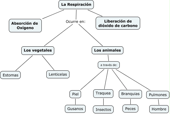 PRUEBA CMAPTOOLS 2, Piel Gusanos, a través de: Traquea, Los vegetales Lenticelas, Traquea Insectos, Los animales a través de:, a través de: Branquias, La Respiración Absorción de Oxígeno, La Respiración Liberación de dióxido de carbono, La Respiración Ocurre en: Los animales, Branquias Peces