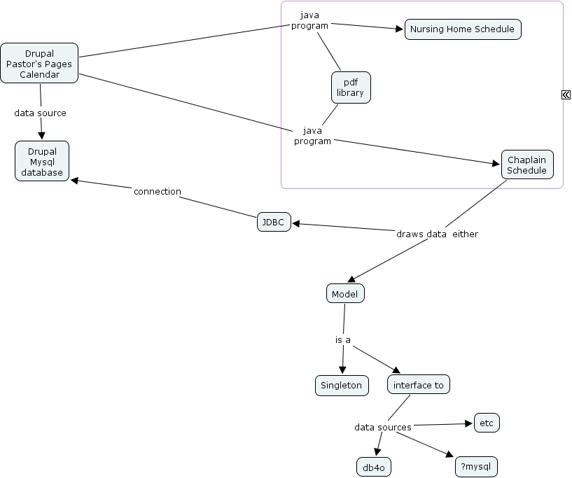 Calendar Letters Project, Chaplain Schedule draws data either Model, interface to data sources etc, pdf library java program Chaplain Schedule, JDBC connection Drupal Mysql database, interface to data sources db4o, Model is a Singleton, pdf library java program Nursing Home Schedule, Drupal Pastor's Pages Calendar java program Nursing Home Schedule, interface to data sources ?mysql, Chaplain Schedule draws data either JDBC