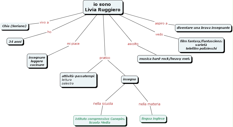la mia prima mappa, io sono Livia Ruggiero pratico attività-passatempi: lettura palestra, io sono Livia Ruggiero aspiro a diventare una brava insegnante, io sono Livia Ruggiero ho 34 anni, io sono Livia Ruggiero mi piace insegnare leggere cucinare, insegno nella materia lingua inglese, io sono Livia Ruggiero ascolto musica hard-rock/heavy metal, io sono Livia Ruggiero vivo a Chia (Soriano), io sono Livia Ruggiero vedo film fantasy/fantascienza varietà telefilm polizieschi, io sono Livia Ruggiero pratico insegno, insegno nella scuola istituto comprensivo Canepina Scuola Media