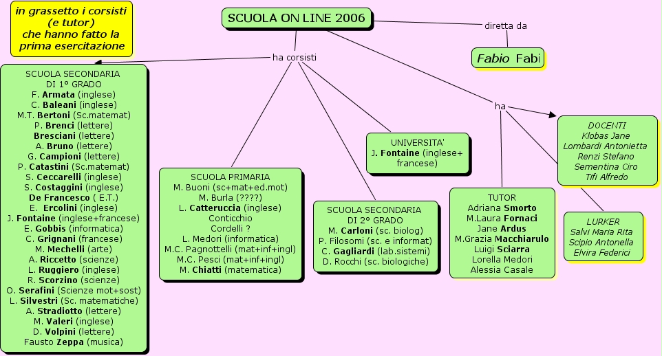 tipologia_scuole_corsisti, SCUOLA ON LINE 2006 ha corsisti SCUOLA PRIMARIA M. Buoni (sc+mat+ed.mot) M. Burla (????) L. Catteruccia (inglese) Conticchio Cordelli ? L. Medori (informatica) M.C. Pagnottelli (mat+inf+ingl) M.C. Pesci (mat+inf+ingl) M. Chiatti (matematica), SCUOLA ON LINE 2006 ha TUTOR Adriana Smorto M.Laura Fornaci Jane Ardus M.Grazia Macchiarulo Luigi Sciarra Lorella Medori Alessia Casale, SCUOLA ON LINE 2006 ha corsisti UNIVERSITA' J. Fontaine (inglese+ francese), SCUOLA ON LINE 2006 ha DOCENTI Klobas Jane Lombardi Antonietta Renzi Stefano Sementina Ciro Tifi Alfredo, SCUOLA ON LINE 2006 ha corsisti SCUOLA SECONDARIA DI 2° GRADO M. Carloni (sc. biolog) P. Filosomi (sc. e informat) C. Gagliardi (lab.sistemi) D. Rocchi (sc. biologiche), SCUOLA ON LINE 2006 diretta da Fabio Fabi, SCUOLA ON LINE 2006 ha corsisti SCUOLA SECONDARIA DI 1° GRADO F. Armata (inglese) C. Baleani (inglese) M.T. Bertoni (Sc.matemat) P. Brenci (lettere) Bresciani (lettere) A. Bruno (lettere) G. Campioni (lettere) P. Catastini (Sc.matemat) S. Ceccarelli (inglese) S. Costaggini (inglese) De Francesco ( E.T.) E. Ercolini (inglese) J. Fontaine (inglese+francese) E. Gobbis (informatica) C. Grignani (francese) M. Mechelli (arte) A. Riccetto (scienze) L. Ruggiero (inglese) R. Scorzino (scienze) O. Serafini (Scienze mot+sost) L. Silvestri (Sc. matematiche) A. Stradiotto (lettere) M. Valeri (inglese) D. Volpini (lettere) Fausto Zeppa (musica), SCUOLA ON LINE 2006 ha LURKER Salvi Maria Rita Scipio Antonella Elvira Federici