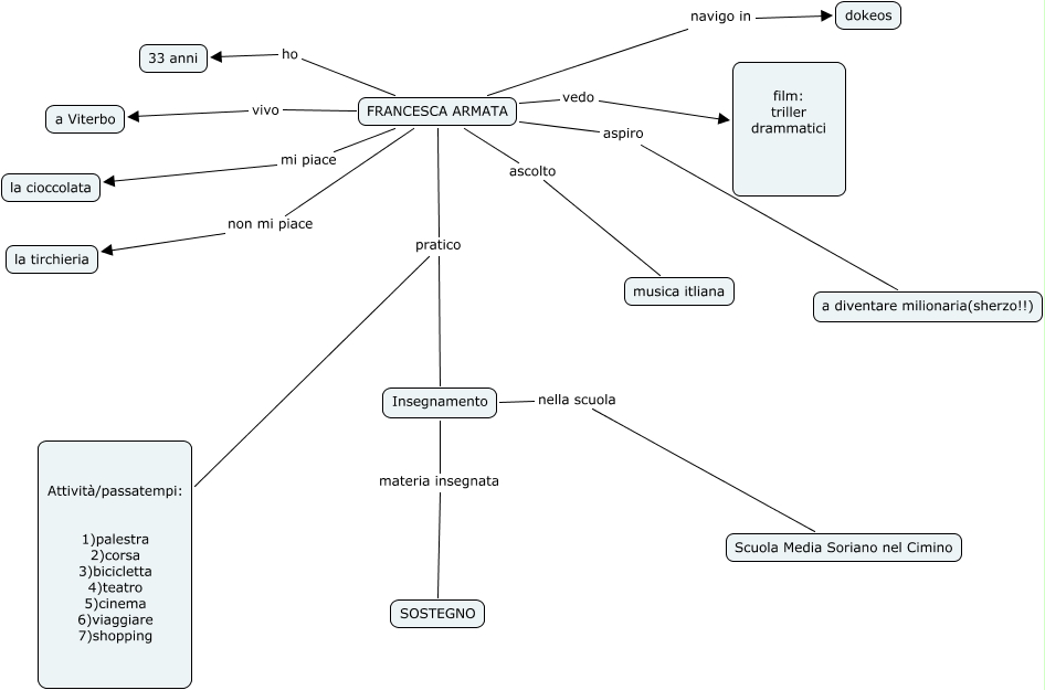 Francesca_Armata, FRANCESCA ARMATA non mi piace la tirchieria, FRANCESCA ARMATA ascolto musica itliana, Insegnamento nella scuola Scuola Media Soriano nel Cimino, FRANCESCA ARMATA vedo film: triller drammatici, FRANCESCA ARMATA vivo a Viterbo, FRANCESCA ARMATA pratico Insegnamento, FRANCESCA ARMATA pratico Attività /passatempi: 1)palestra 2)corsa 3)bicicletta 4)teatro 5)cinema 6)viaggiare 7)shopping, FRANCESCA ARMATA ho 33 anni, FRANCESCA ARMATA navigo in dokeos, FRANCESCA ARMATA aspiro a diventare milionaria(sherzo!!)
