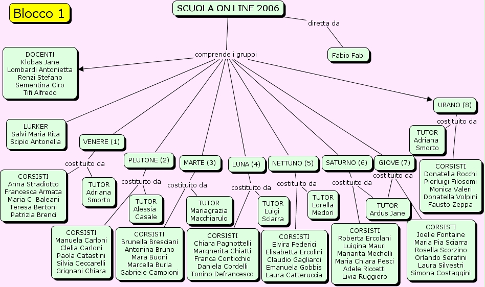 SOL_week2, LUNA (4) costituito da CORSISTI Chiara Pagnottelli Margherita Chiatti Franca Conticchio Daniela Cordelli Tonino Defrancesco, SCUOLA ON LINE 2006 diretta da Fabio Fabi, SCUOLA ON LINE 2006 comprende i gruppi DOCENTI Klobas Jane Lombardi Antonietta Renzi Stefano Sementina Ciro Tifi Alfredo, PLUTONE (2) costituito da CORSISTI Manuela Carloni Clelia Carloni Paola Catastini Silvia Ceccarelli Grignani Chiara, GIOVE (7) costituito da TUTOR Ardus Jane, URANO (8) costituito da TUTOR Adriana Smorto, LUNA (4) costituito da TUTOR Luigi Sciarra, MARTE (3) costituito da CORSISTI Brunella Bresciani Antonina Bruno Mara Buoni Marcella Burla Gabriele Campioni, SCUOLA ON LINE 2006 comprende i gruppi LURKER Salvi Maria Rita Scipio Antonella, SATURNO (6) costituito da TUTOR Ardus Jane