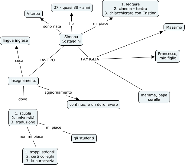 simona costaggini, Simona Costaggini sono nata Viterbo, Simona Costaggini ho 37 - quasi 38 - anni, Simona Costaggini FAMIGLIA Massimo, Simona Costaggini LAVORO insegnamento, insegnamento aggiornamento continuo, è un duro lavoro, insegnamento cosa lingua inglese, Simona Costaggini FAMIGLIA mamma, papà sorelle, 1. scuola 2. università 3. traduzione mi piace gli studenti, Simona Costaggini mi piace 1. leggere 2. cinema - teatro 3. chiacchierare con Cristina, Simona Costaggini FAMIGLIA Francesco, mio figlio