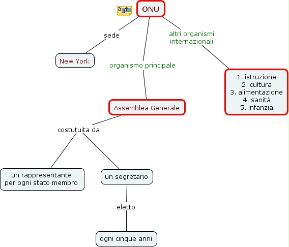 ONU, ONU sede New York, un segretario eletto ogni cinque anni, ONU altri organismi internazionali 1. istruzione 2. cultura 3. alimentazione 4. sanità 5. infanzia, Assemblea Generale costutuita da un rappresentante per ogni stato membro, ONU organismo principale Assemblea Generale, Assemblea Generale costutuita da un segretario