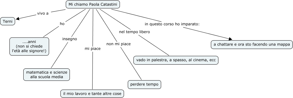 Paola, Mi chiamo Paola Catastini vivo a Terni, Mi chiamo Paola Catastini ho ....anni (non si chiede l'età alle signore!), Mi chiamo Paola Catastini insegno matematica e scienze alla scuola media, Mi chiamo Paola Catastini non mi piace perdere tempo, Mi chiamo Paola Catastini in questo corso ho imparato: a chattare e ora sto facendo una mappa, Mi chiamo Paola Catastini mi piace il mio lavoro e tante altre cose, Mi chiamo Paola Catastini nel tempo libero vado in palestra, a spasso, al cinema, ecc
