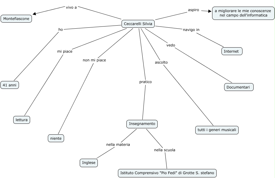 la mia prima mappa Silvia, Ceccarelli Silvia non mi piace niente, Ceccarelli Silvia mi piace lettura, Ceccarelli Silvia ascolto tutti i generi musicali, Insegnamento nella scuola Istituto Comprensivo "Pio Fedi" di Grotte S. stefano, Ceccarelli Silvia pratico Insegnamento, Ceccarelli Silvia vedo Documentari, Ceccarelli Silvia ho 41 anni, Insegnamento nella materia Inglese, Ceccarelli Silvia vivo a Montefiascone, Ceccarelli Silvia aspiro a migliorare le mie conoscenze nel campo dell'informatica