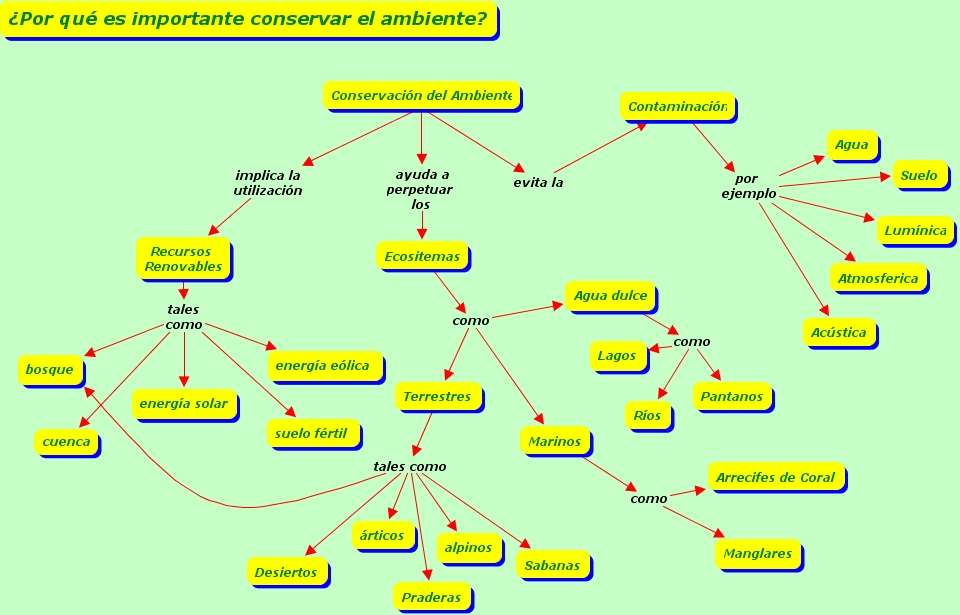 Ecositemas como Marinos, Terrestres tales como alpinos, Contaminación por ejemplo Acústica, Terrestres tales como Desiertos, Agua dulce como Ríos, Ecositemas como Terrestres, Terrestres tales como bosque, Agua dulce como Pantanos, Contaminación por ejemplo Suelo, Ecositemas como Agua dulce, Recursos Renovables tales como energía solar, Terrestres tales como Sabanas, Terrestres tales como árticos, Terrestres tales como Praderas, Conservación del Ambiente evita la Contaminación, Contaminación por ejemplo Lumínica, Recursos Renovables tales como energía eólica, Agua dulce como Lagos, Contaminación por ejemplo Agua, Recursos Renovables tales como cuenca, Contaminación por ejemplo Atmosferica, Recursos Renovables tales como bosque, Recursos Renovables tales como suelo fértil, Conservación del Ambiente ayuda a perpetuar los Ecositemas, Conservación del Ambiente implica la utilización Recursos Renovables, Marinos como Manglares, Marinos como Arrecifes de Coral